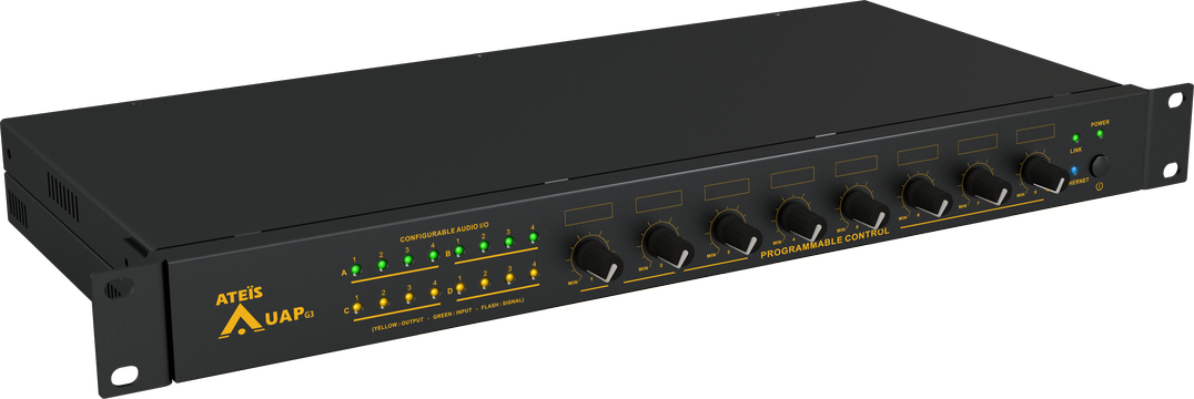 As our state of the art DSP processor, the UAP G3/UAP G3H also incorporates full drag n' drop DSP component libraries such as AGC, AEC, Ducker, various kinds of Mixer, Delay, A.N.G (Auto Noise Gain), ANR (Ambient Noise Reduction), PEQ, Feedback, Hi/Lo Pass, message player, event scheduler for element adjustment, preset changes and event control, dynamic zone paging, In/Out audio streaming, VoIP/SIP for teleconferencing, level control, telephone transmit/receive, audio recorder, etc. making the entire system flexible and easy to program and integrate. The UAP G3/UAP G3H features 8 programmable knobs, each knob can be programmed in custom DSP parameter for intuitive control without PC or any other software.